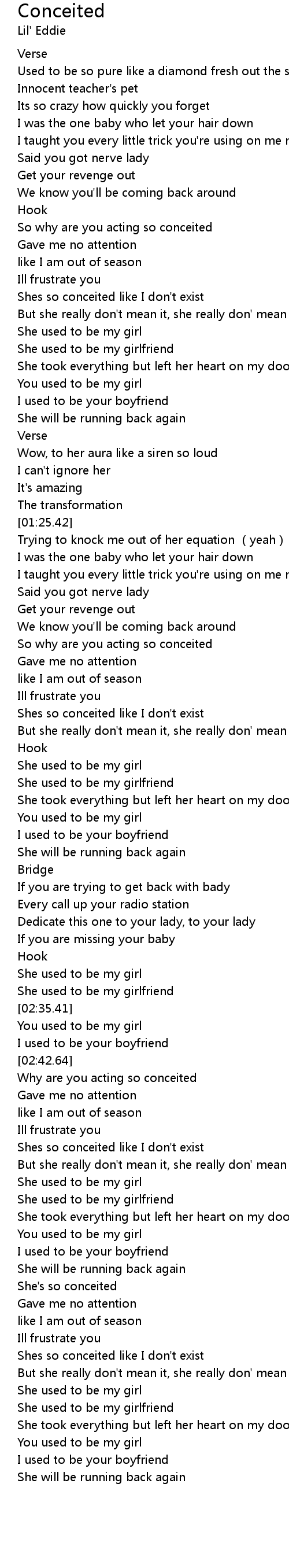 | [00:53.35] | Shes so conceited like I don't exist |