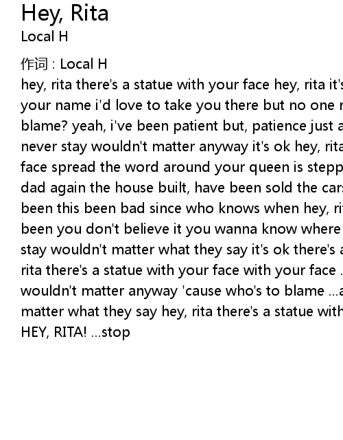 | hey, rita there' s a statue with your face hey, rita it' s in the park, baring your name i' d love to take you there but no one really cares, and who' s to blame? yeah, i' ve been patient but, patience just another game ... and if you never stay wouldn' t matter anyway it' s ok hey, rita there' s a statue with your face spread the word around your queen is steppin' down livin' with your mom and dad again the house built, have been sold the cars have all been towed it hasn' t been this been bad since who knows when hey, rita we wanna know where you have been you don' t believe it you wanna know where we were then ... and if you never stay wouldn' t matter what they say it' s ok there' s a statue with your face hey, rita there' s a statue with your face with your face ... and if you never stay wouldn' t matter anyway ' cause who' s to blame ... and if you never stay doesn' t matter what they say hey, rita there' s a statue with your face with your face | |