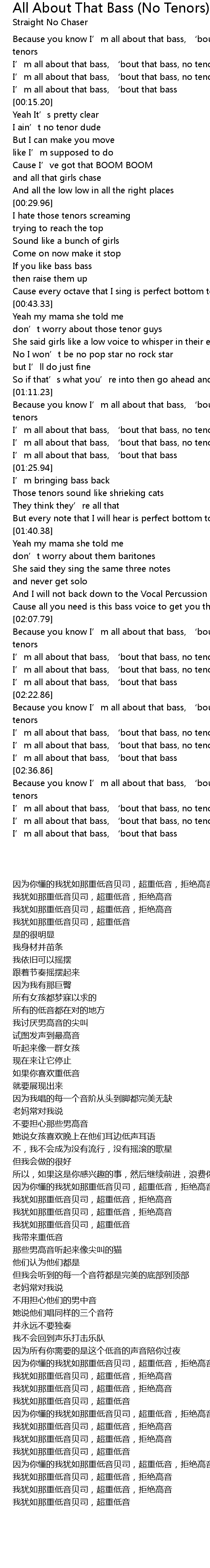| [02:23.25] | Because you know I’m all about that bass, ‘bout that bass, no tenors |
