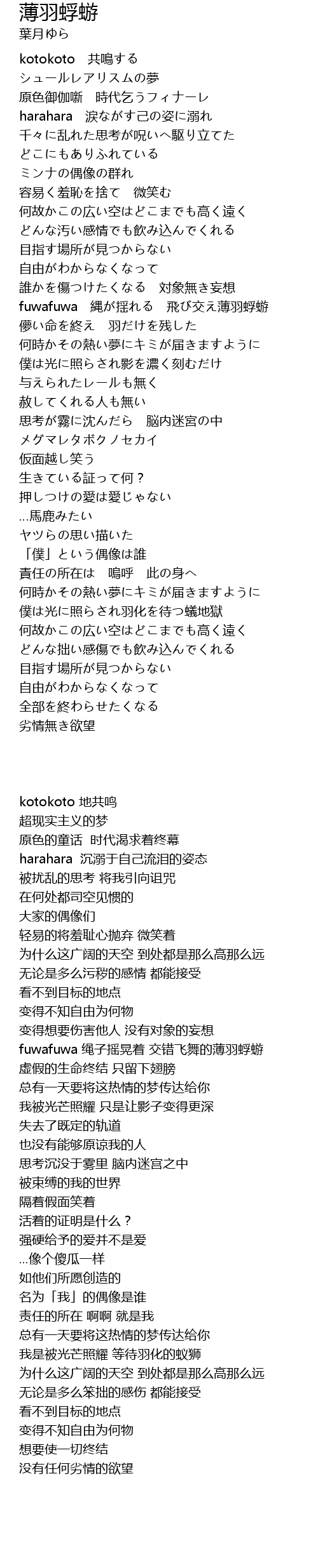 | [01:32.04] | fuwafuwa 縄が揺れる 飛び交え薄羽蜉蝣 |
