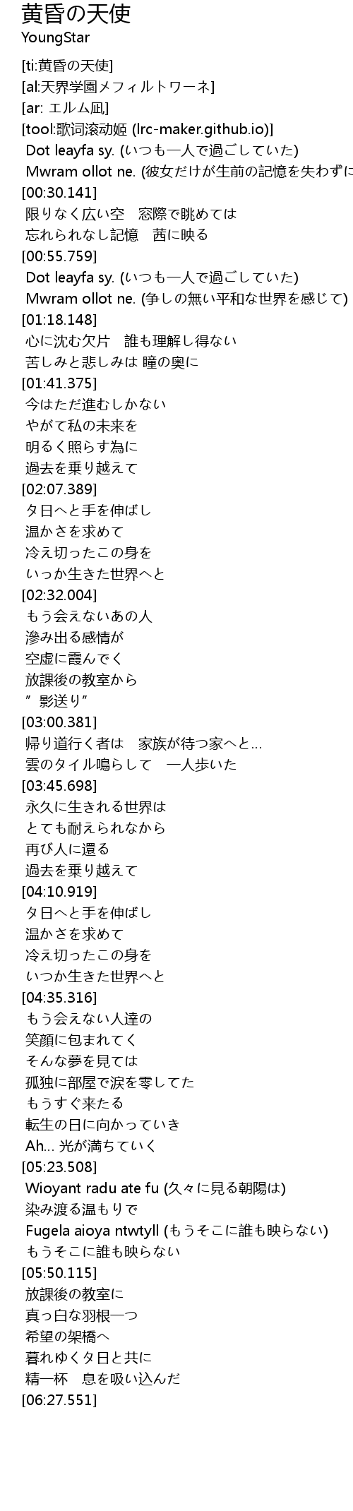 | [01:11.354] | Mwram ollot ne. (争しの無い平和な世界を感じて) |