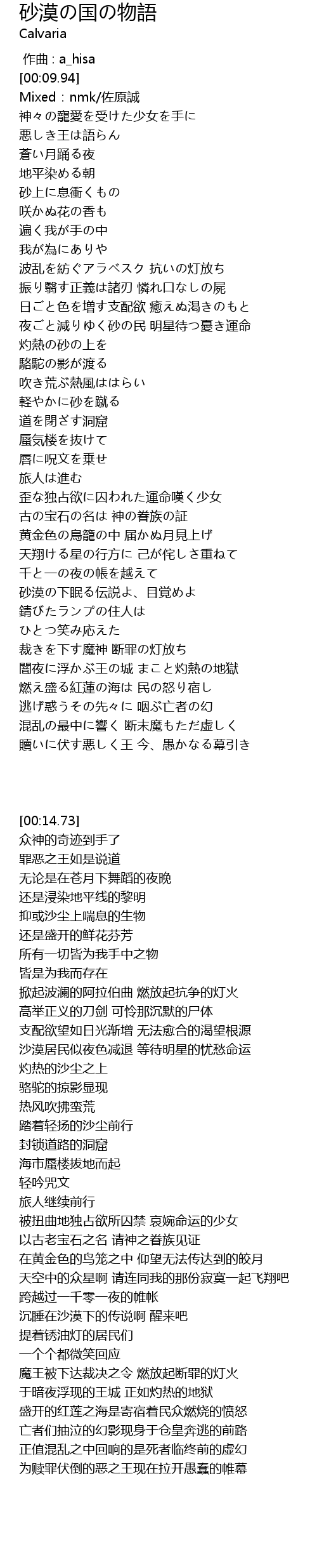 | [01:15.81] | 夜ごと減りゆく砂の民 明星待つ憂き運命 |