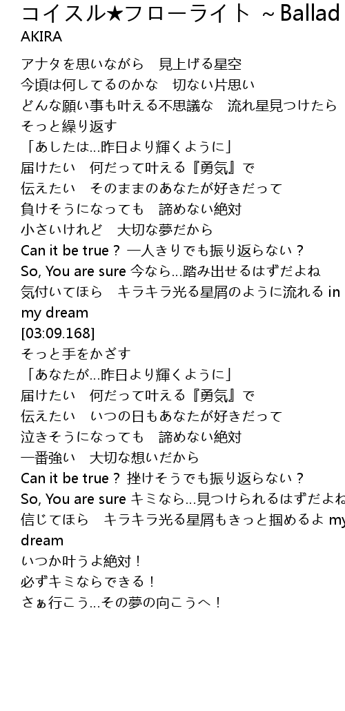 | [02:41.000] | 気付いてほら キラキラ光る星屑のように流れる in my dream |