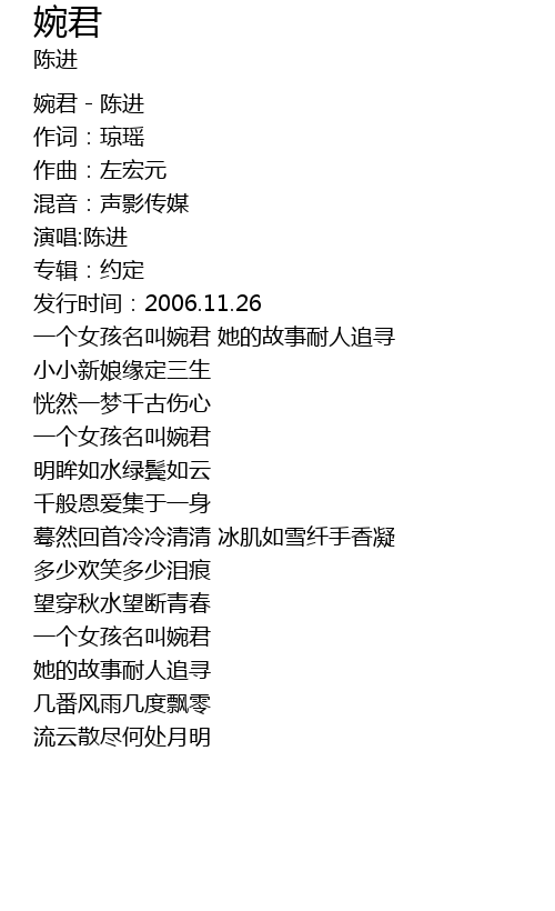 | [00:07.39] | 一个女孩名叫婉君 她的故事耐人追寻 |