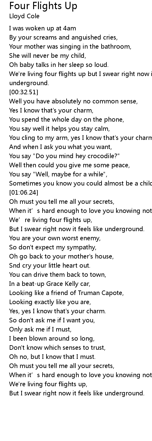 | [01:18.38] | We’re living four flights up, |
