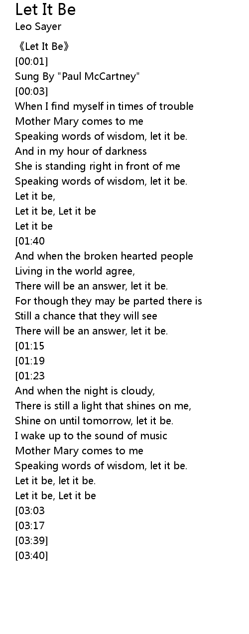 | [02:26][01:40][00:40] | Whisper words of wisdom, let it be. |