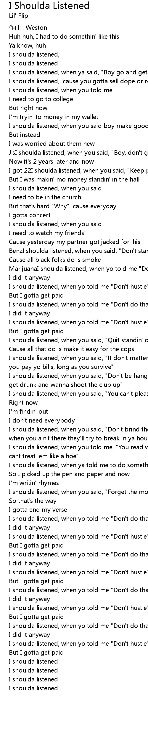| I shoulda listened, when you told me, " You read what ya soSo everybody I meet I cant treat ' em like a hoe" | |