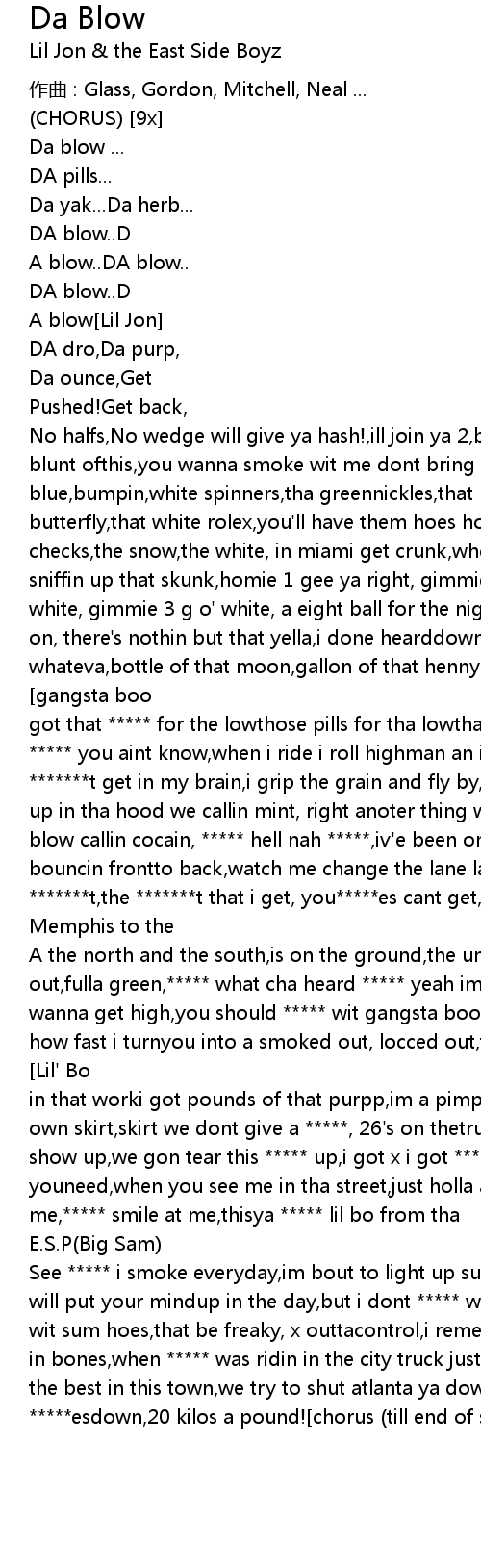 | No halfs,No wedge will give ya hash!,ill join ya 2,but do ya *****s smoke a blunt ofthis,you wanna smoke wit me dont bring no bull*******t,da blue,bumpin,white spinners,tha greennickles,that red superman,that peach butterfly,that white rolex,you'll have them hoes hotterthan a box of stolen checks,the snow,the white, in miami get crunk,when i see em in tha club theybe sniffin up that skunk,homie 1 gee ya right, gimmie 1g o' white, gimmie 2g o' white, gimmie 3 g o' white, a eight ball for the night.if you wanna get cha lean on, there's nothin but that yella,i done hearddown in texas them *****s got whateva,bottle of that moon,gallon of that henny mix it wit that crunkjuice,we'll have a ***** spinnin like that[chorus 5x][gangsta boo]yeah i got that ***** for the lowthose pills for tha lowthat blow for tha lowyoung ***** you aint know,when i ride i roll highman an i aint tellin no lie,when this *******t get in my brain,i grip the grain and fly by,say dawg you got that good up in tha hood we callin mint, right anoter thing we do is blow callit blew,we blow callin cocain, ***** hell nah *****,iv'e been on that lean lean hard bouncin frontto back,watch me change the lane lane,'cause dont be talkin that *******t,the *******t that i get, you*****es cant get,from | |