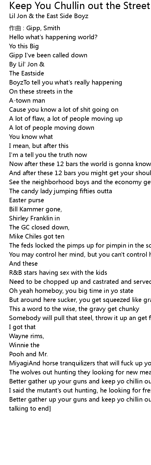 | Better gather up your guns and keep yo chillin out the street, nigga[Big Gipp talking to end] |