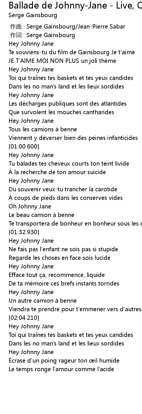 | [00:00.00] | 作曲 : Serge Gainsbourg/Jean-Pierre Sabar |