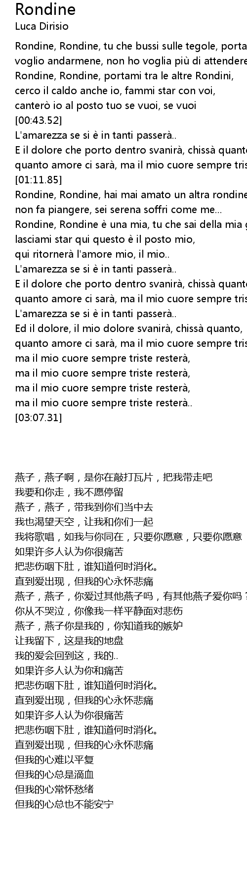| [01:13.59] | Rondine, Rondine, hai mai amato un altra rondine ed è li con te, |