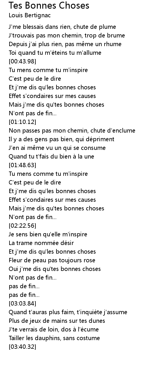 | [01:56.42] | Et j' me dis qu' les bonnes choses |