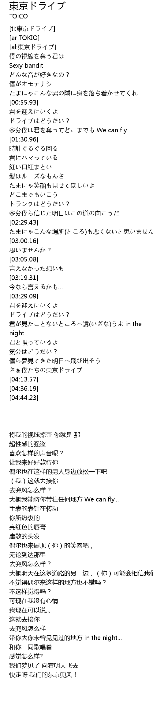 | [04:04.28] | さぁ僕たちの東京ドライブ |