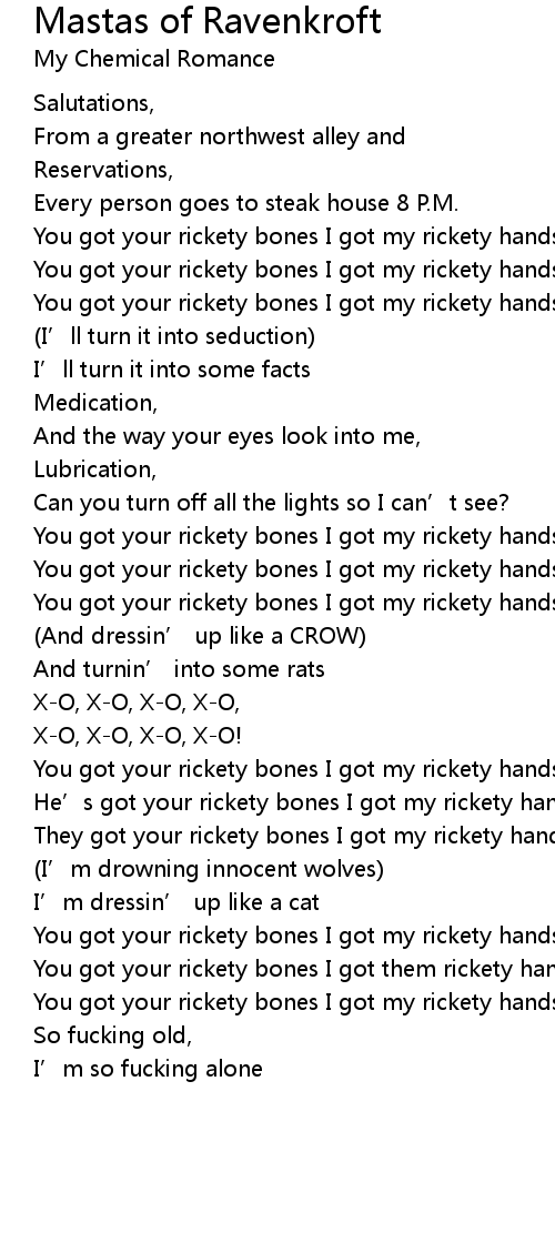 | [01:27.401] | You got your rickety bones I got them rickety hands, |