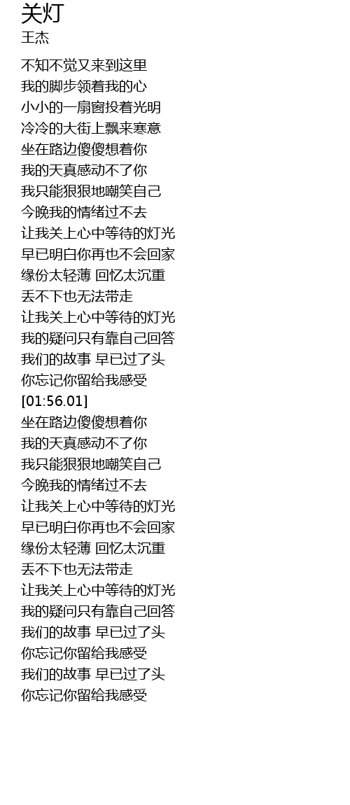 | [01:33.64] | 让我关上心中等待的灯光 |