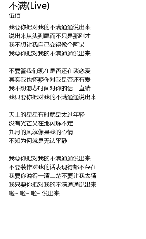 | wǒ zhǐ yào nǐ bǎ duì wǒ de bù mǎn tōng tōng shuō chū lái | |
