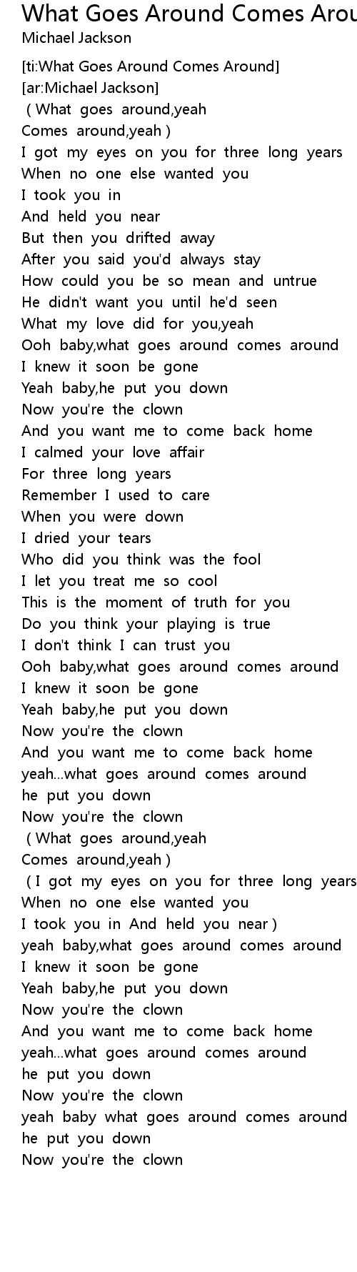 | [00:49.79] | Ooh baby, what goes around comes around |
