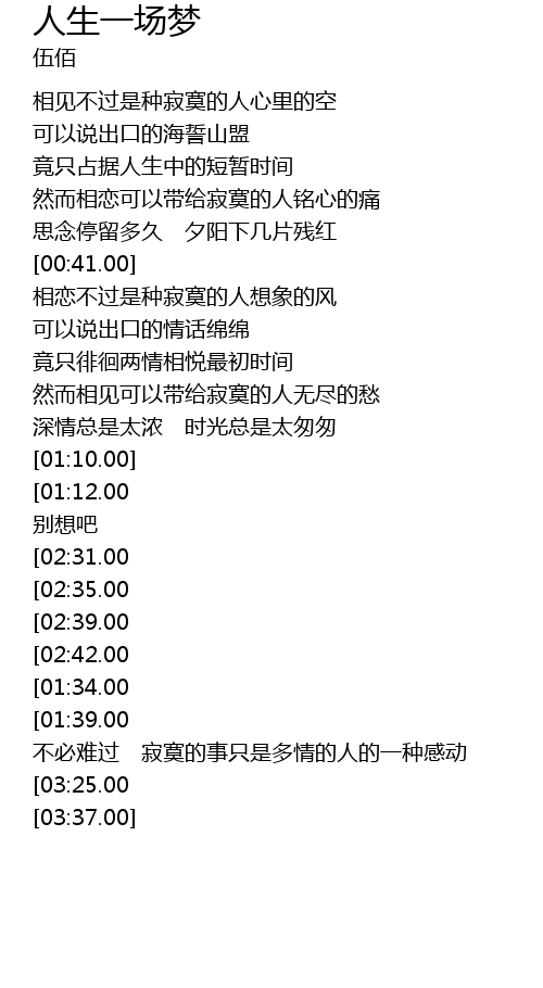 | [03:32.00][03:25.00][03:18.00] | shuí shuō rén shēng nán dǒng zhǐ bù guò shì yī chǎng mèng |
