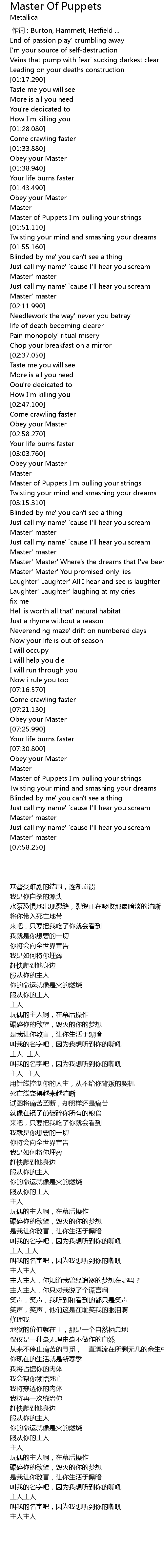 | [01:48.110] | Master of Puppets I'm pulling your strings |