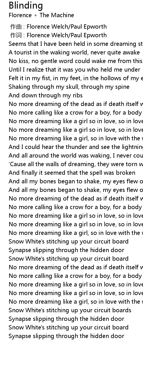 | [00:01.00] | 作词 : Florence Welch/Paul Epworth |