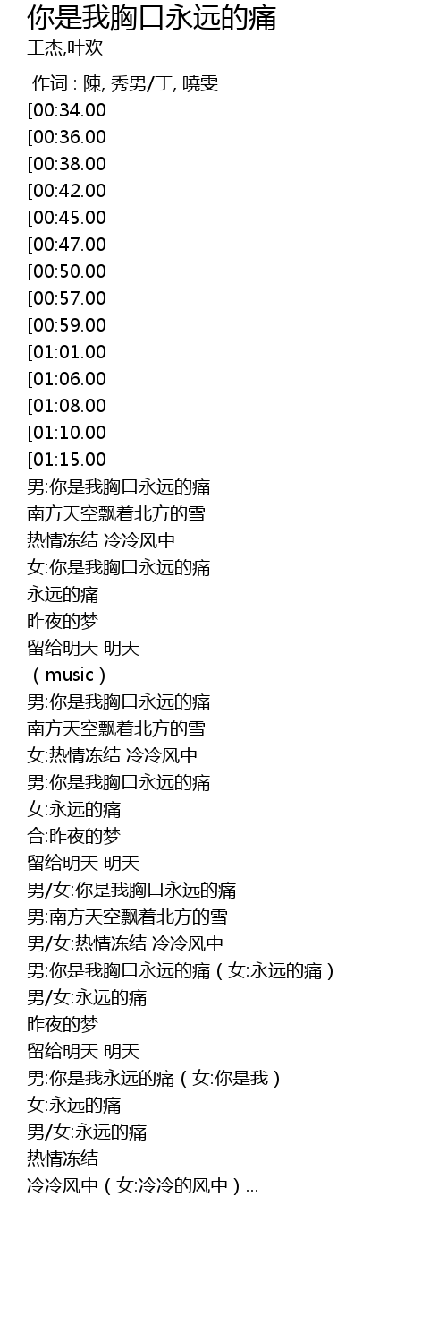 [04:12.00] nan: ni shi wo xiong kou yong yuan de tong nv: yong yuan de tong
