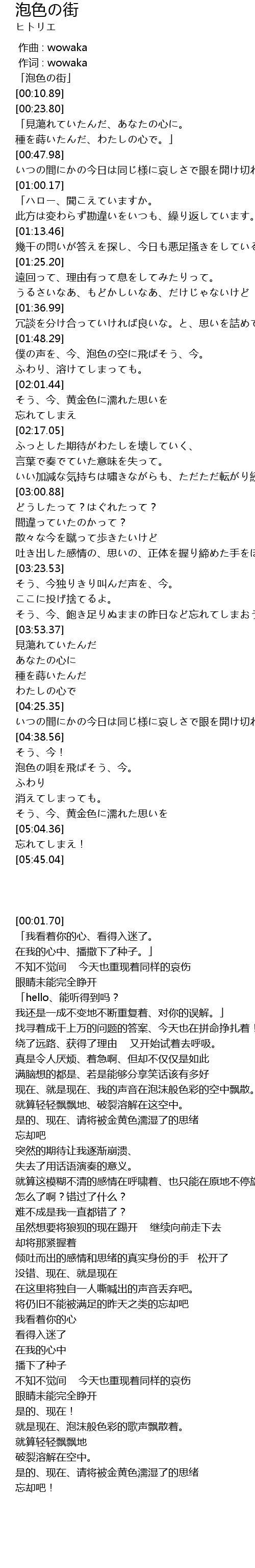 | [04:46.37] | 泡色の唄を飛ばそう、今。 |