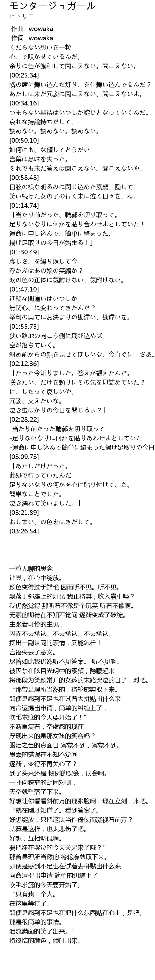 | [00:21.42] | 余りに色が飽和して聞こえない。聞こえない。 |