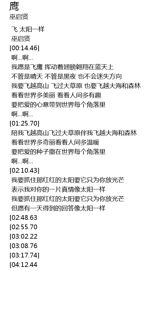 | [00:42.02] | 我愿是飞鹰 挥动着翅膀翱翔在蓝天上 |