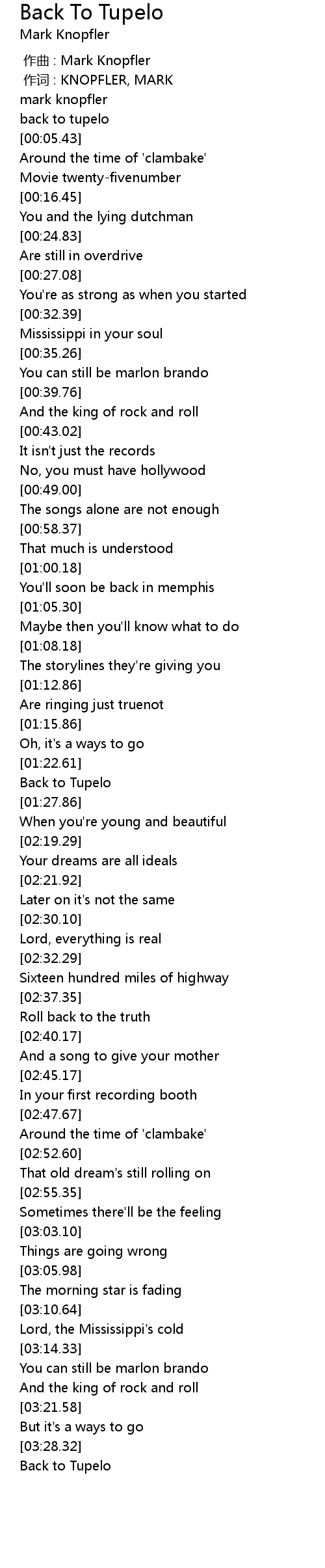 | [03:32.95] | Back to Tupelo |