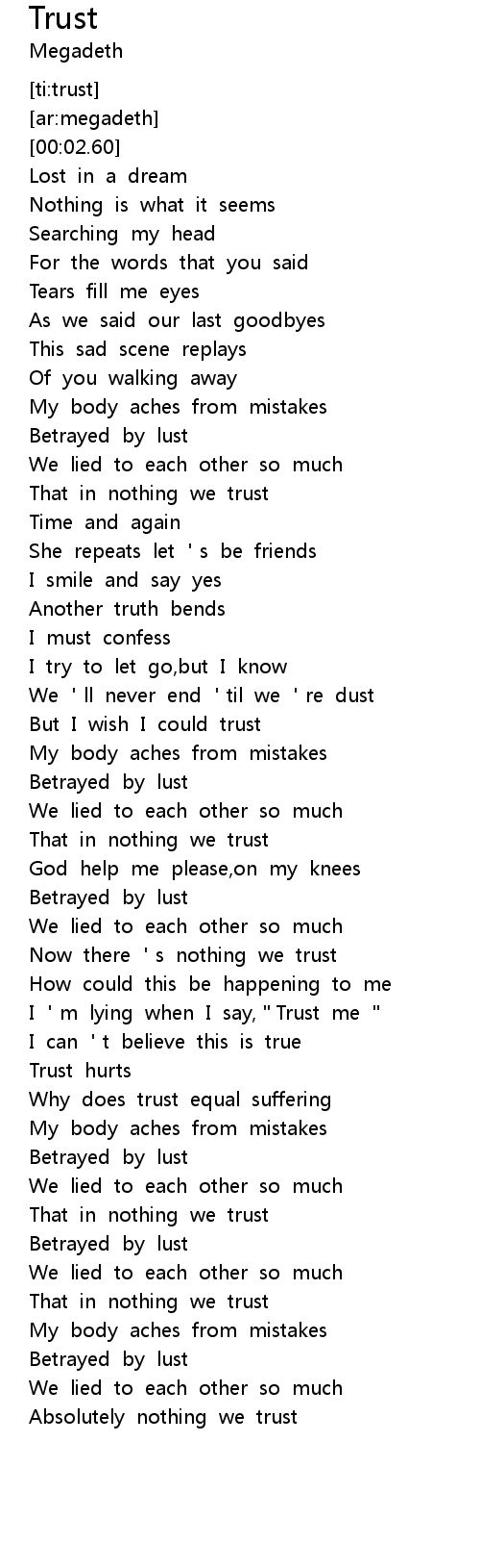 | [03:01.617] | I 'm lying when I say,"Trust me " |