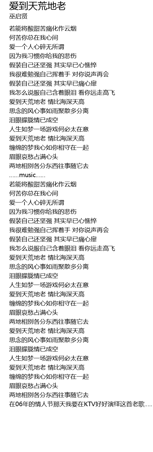 | [03:42.00] | ài dào tiān huāng dì lǎo qíng bǐ hǎi shēn tiān gāo |