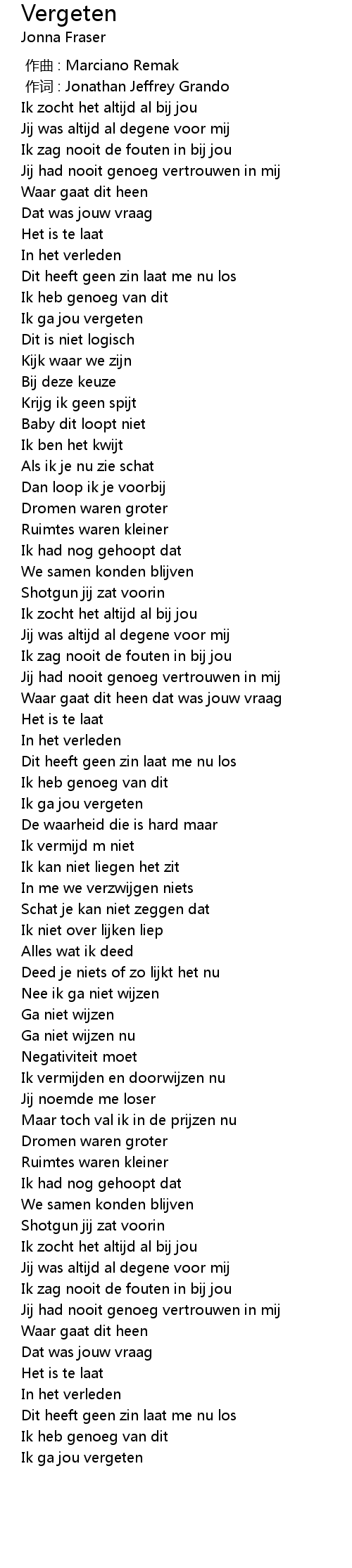 | [03:17.72] | Ik ga jou vergeten |