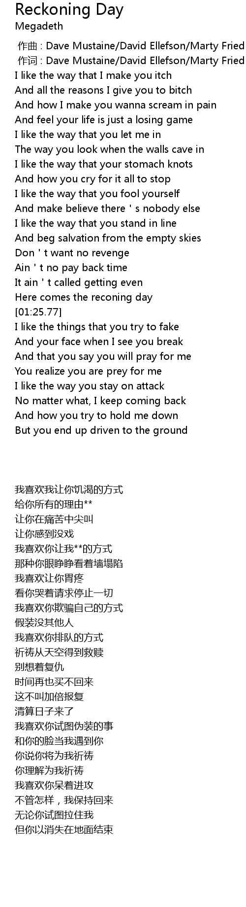 | [00:01.00] | 作词 : Dave Mustaine/David Ellefson/Marty Friedman/Nick Menza |