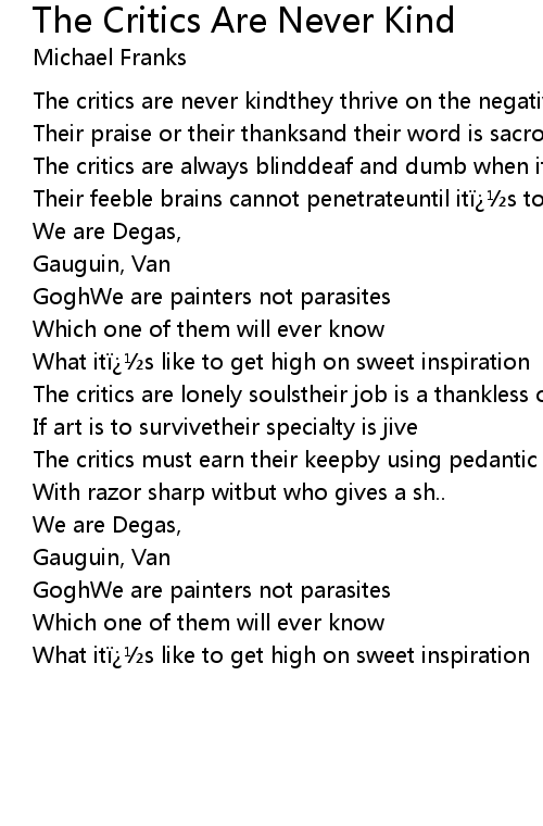 | The critics are never kindthey thrive on the negativethey seldom give | |