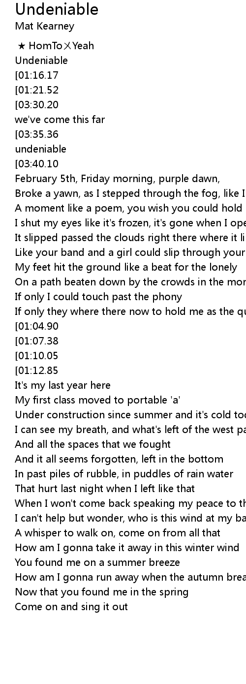 | [03:56.74][03:35.36][02:41.40][01:32.03][00:34.23] | It' s unmistakable that you' re undeniable |