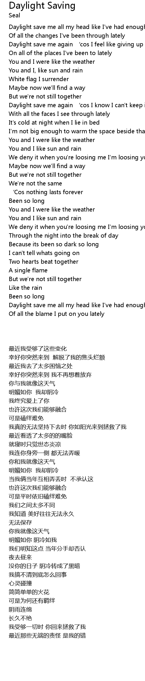 | [00:00.45] | Daylight save me all my head like I've had enough |
