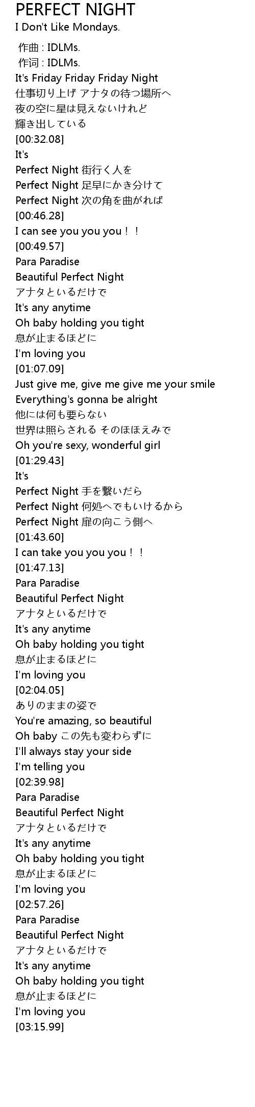| [01:34.71] | Perfect Night 何処へでもいけるから |
