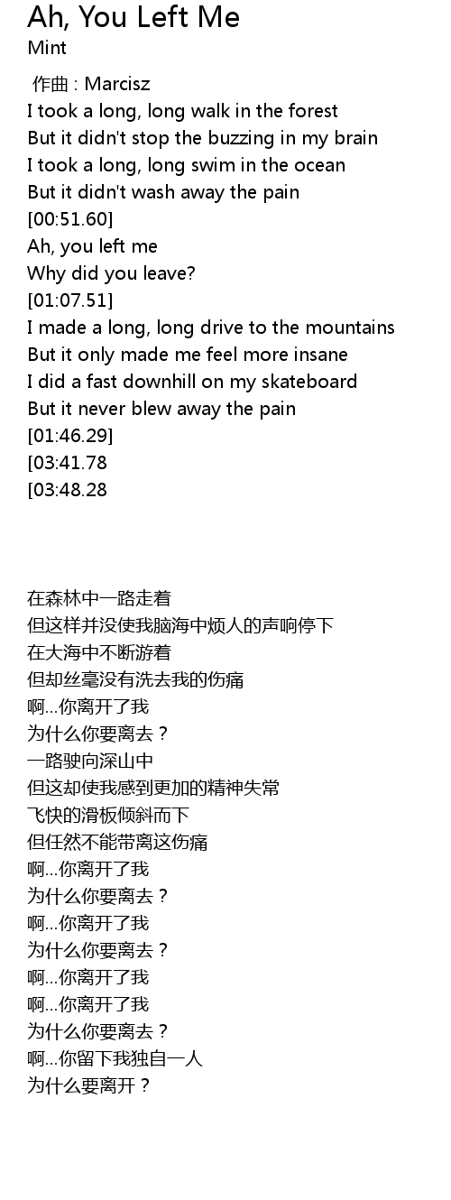 | [04:00.14][03:41.78][02:23.80][02:05.78][01:46.74] | Ah, you left me |