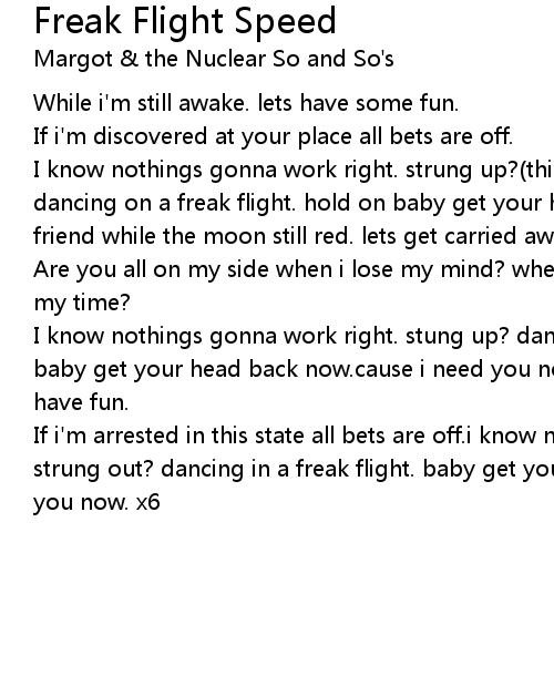 I know nothings gonna work right. strung up?(this is where i'm having trouble) dancing on a freak flight. hold on baby get your head back now.once i met a friend while the moon still red. lets get carried away. lets lose out heads. |