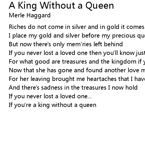 For what good are treasures and the kingdom if you're a king without a queen |