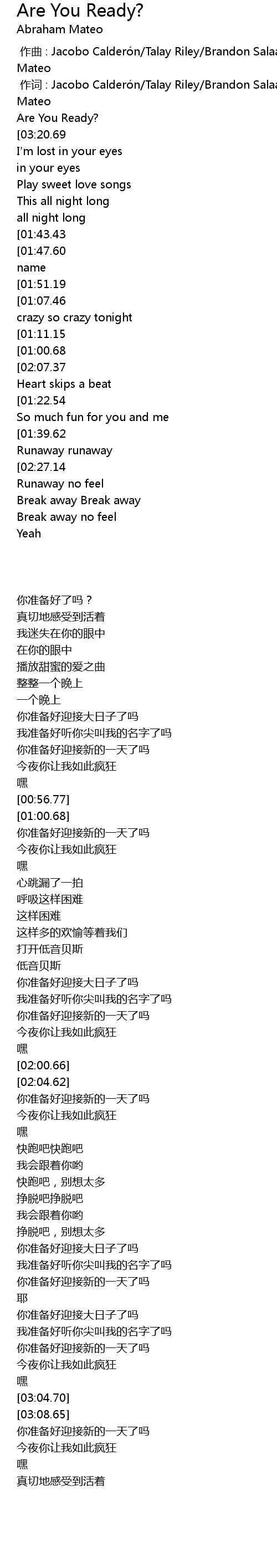 | [00:00.00] | 作词 : Jacobo Calderón/Talay Riley/Brandon Salaam Bailey/Abraham Mateo |