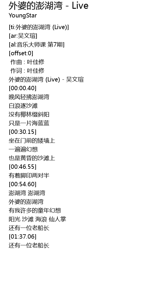 | [00:00.10] | 外婆的澎湖湾 (Live) - 吴文瑄 |