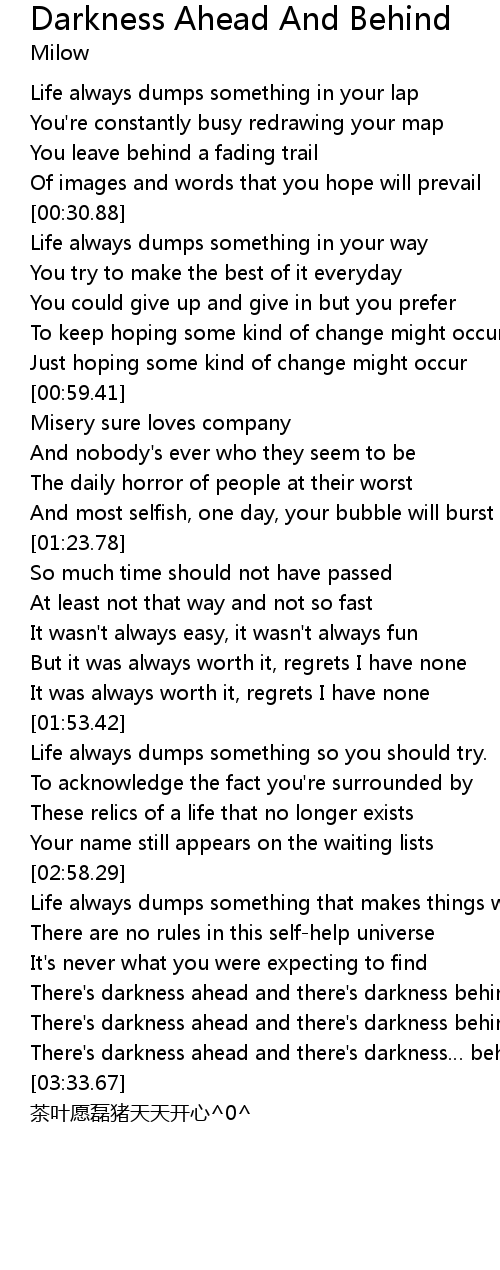 | [03:20.40] | There' s darkness ahead and there' s darkness behind |