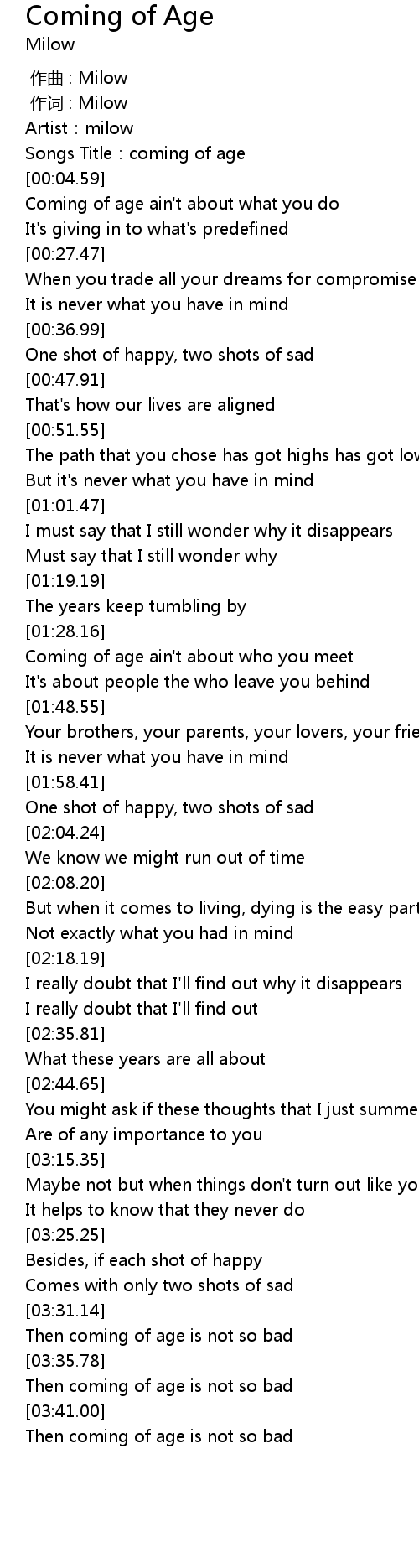 | [01:40.89] | Coming of age ain' t about who you meet |