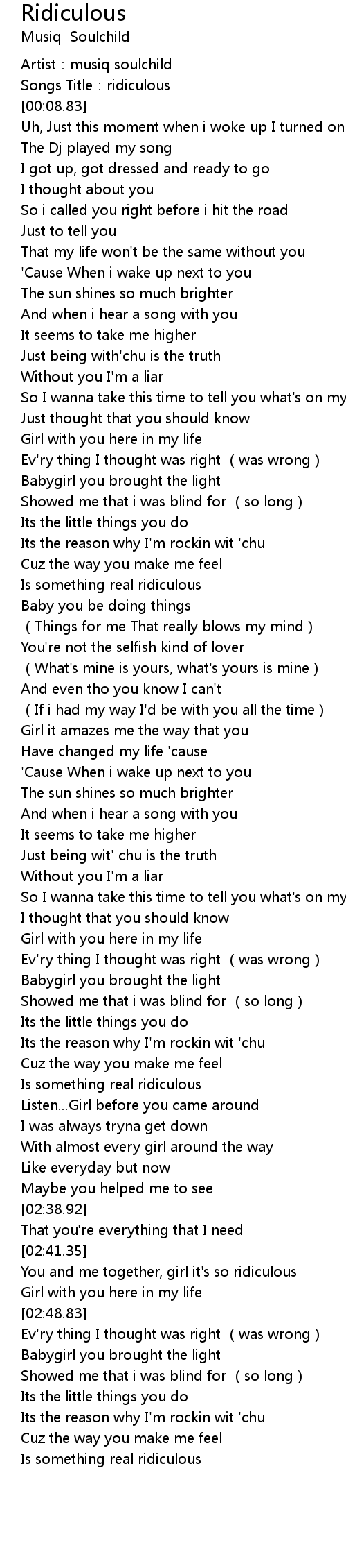 | [02:42.41] | You and me together, girl it's so ridiculous |
