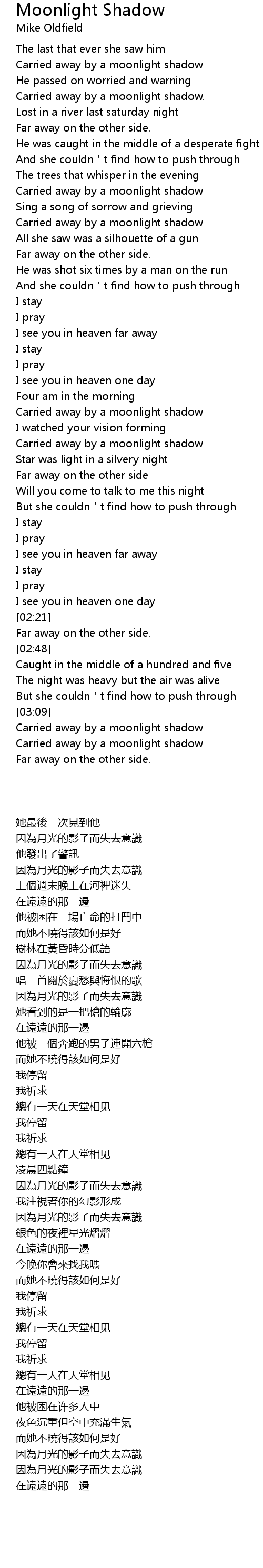 | [01:33] | Carried away by a moonlight shadow |