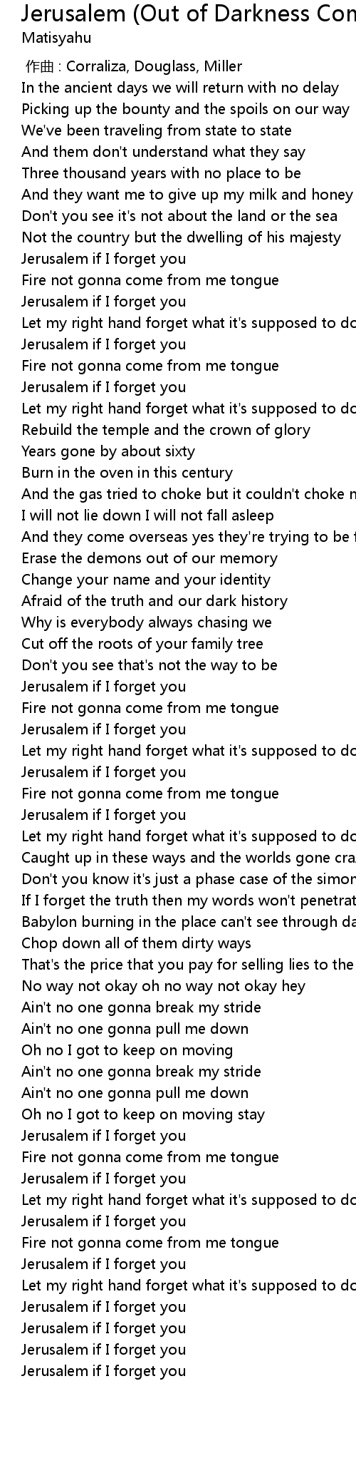 | Song | Jerusalem (Out of Darkness Comes Light) |