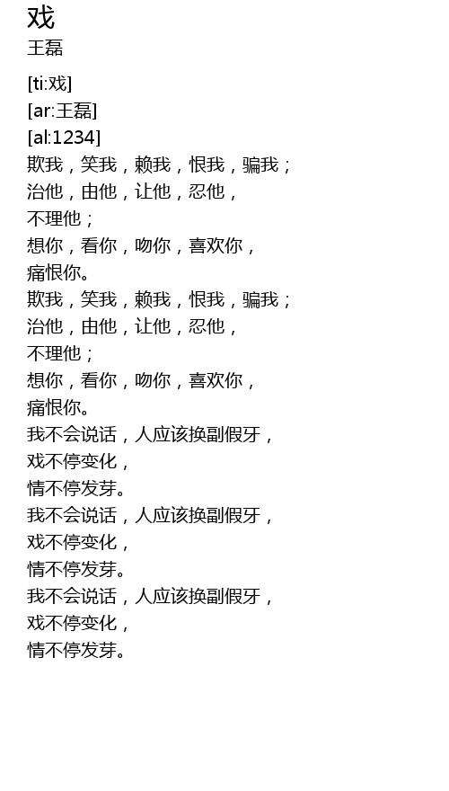 | [00:57.45] | qī wǒ, xiào wǒ, lài wǒ, hèn wǒ, piàn wǒ |