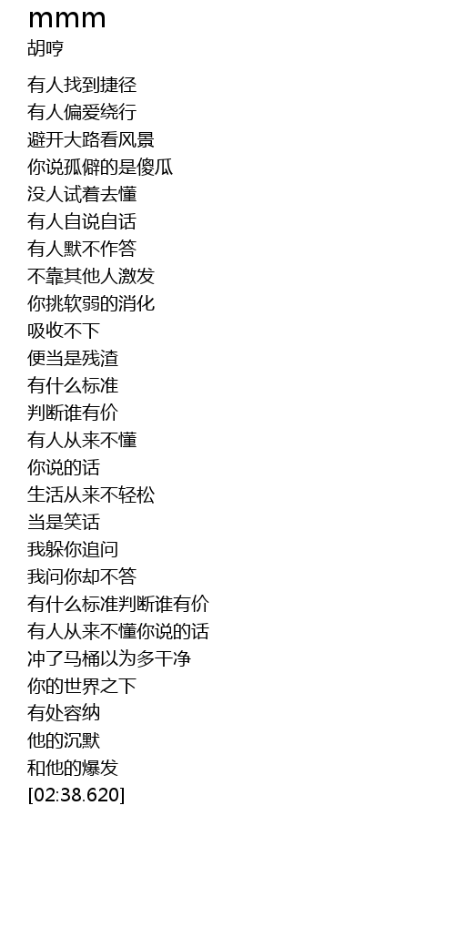 | [01:58.410] | yǒu rén cóng lái bù dǒng nǐ shuō de huà |