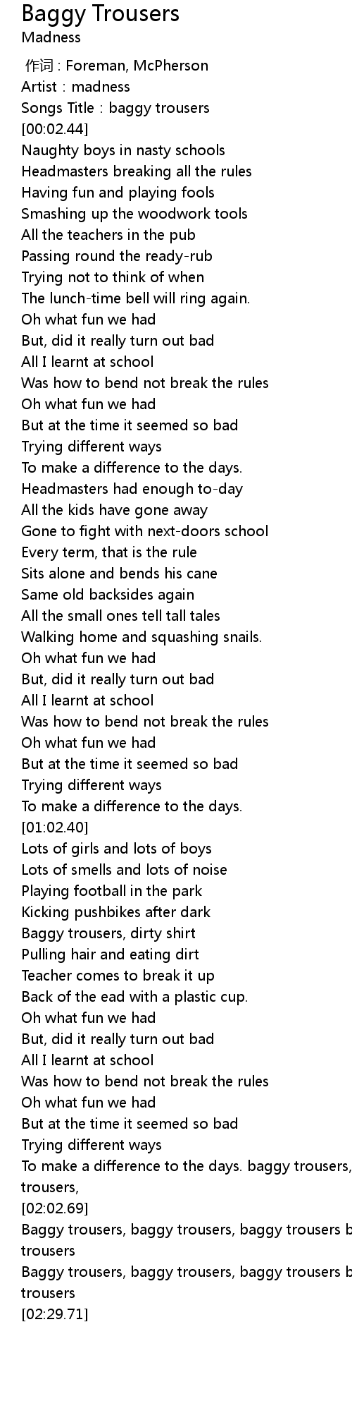 | [02:16.29] | Baggy trousers, baggy trousers, baggy trousers baggy trousers, baggy trousers |